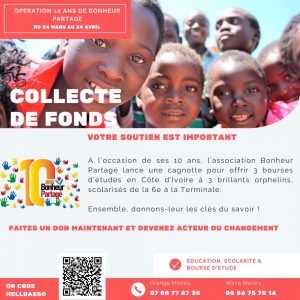 Bonheur Partagé remercie chaleureusement tous les donateurs qui ont participé à cette collecte, permettant ainsi d’atteindre la somme de 8 306€ au 20 Mai 2023 soit environ 5 440 430 FCFA. Ce montant permettra de renforcer nos actions en faveur des orphelins et des plus démunis.