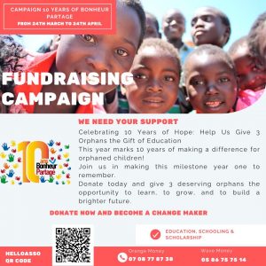 Pour célébrer notre 10e anniversaire, nous sollicitons votre aide pour fournir à trois incroyables orphelins l’éducation qu’ils méritent et construire un avenir meilleur. L’éducation est la clé pour briser le cycle de la pauvreté, et avec votre soutien, nous pouvons faire en sorte que ces enfants aient la possibilité de réussir.